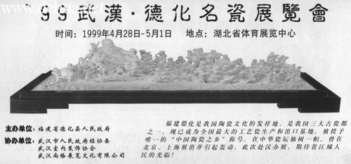 福建德化是我国陶瓷文化的发祥地,是我国三大古瓷都之一,现已成为全国最大的工艺瓷生产和出口基地,被授予唯一的“中国陶瓷之乡”称号,在中华瓷坛独树一帜,曾在北京、上海展出并引起轰动,此次赴汉办展,期待着江城人民的光临!