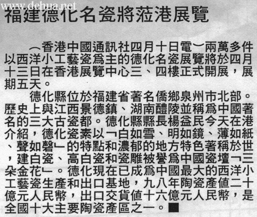 德化县位于福建省著名侨乡泉州市北部。历史上怀江西景德镇、湖南醴陵并称为中国著名的三大古瓷都。德化县县杨益民今天在港介绍,德化瓷素以『白如雪、明如镜、薄如纸、声如磬』的特点和浓郁的地方特色著称於于世,建白瓷、高白瓷和瓷雕被誉为中国瓷坛『三朵金花』。德化现在已成为中国最大的西洋小工艺瓷生产和出口基地,九八年陶瓷产值二十亿元人民币,出口交货值十六亿元人民币,是全国十大主要陶瓷产区之一。