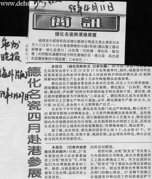 福建省外经委和政府德化县部分陶瓷生产企业参加本朋十三日至十七日在香港举办的中国(香港)礼品暨工艺品展览会。德化瓷素以『白如雪、明如镜、薄如纸、声如磬』的特点和浓郁的地方特色著称于世,建白瓷、高白瓷和瓷雕被誉为中国瓷坛『三朵金花』。
