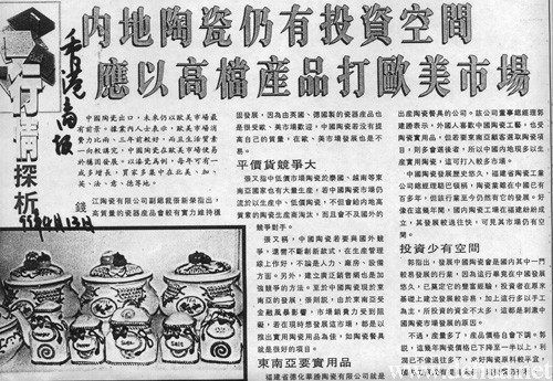 强又称,中国陶瓷若要与国外竞争,还需不断创新款式,在生产管理线上作好,不论是人力、厂房、设备方面。另外,建立广泛销售网也是加强竞争的方法。至於中国陶瓷现於东南亚的发展,张则说,由於东南亚受金融风暴影响,市场销费力受到阻礙,若在现时想发展这市场,都是以推出实用陶瓷用品为佳,如陶瓷餐具就是很好的项目。