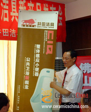另外,俱乐部的成立得到了佛山市井田陶瓷公司的大力支持,在会议上同时举行了井田洁具新产品发布会。该公司董事长兼总经理陈小练先生为来宾介绍了公司新推出的专利产品——落地式虹吸的小便器。