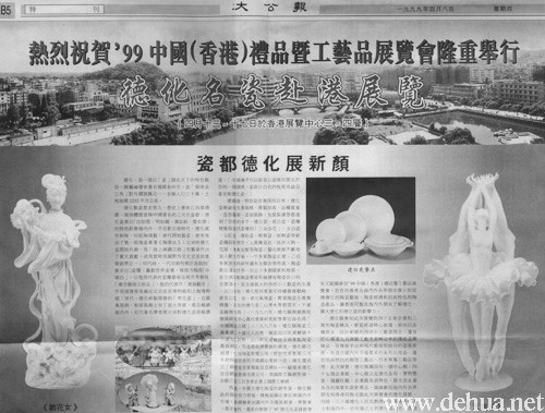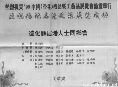德化县参加此次展览的四十五家企业和二万件陶瓷精品,都是经过精心挑选。其中以品种齐全、设计新颖的西洋小工艺瓷为主,还有匠心独特出自高级工艺美术师之手的传统瓷雕精品,有传统手法与现代艺术相结合的瓷苑奇葩,有适合国内外市场需求的系列日用瓷,还有别具特色的树脂工艺品、竹木草藤工艺品等等。此次展览,德化展团设有一个中心馆,四十七个企业馆。中心馆立足德化全局,实物丰富,瑰丽壮观;企业馆各具特色,展示出企业各自的风貌和创新产品。竭诚欢迎海内外各界朋友和香港同胞光临此次展览会的德化展馆。同时,三十万德化人民也热情欢迎香港各界人士和海内外一切有识之士到德化县观光、旅游。