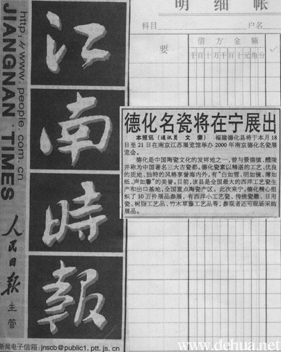 本报讯(通讯员 文 荣) 福建德化县将于本月18日至21日在南京江苏展览馆举办2000年南京德化名瓷展览会。