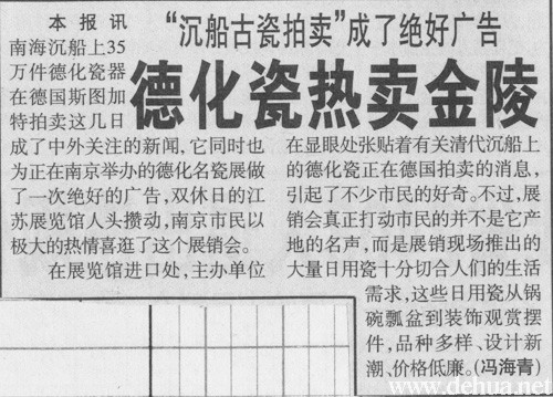 本报讯 南海沉船上35万件德化瓷器在德国斯图加特拍卖这几日成了中外关注的新闻,它同时也为正在南京举办的德化名瓷展做了一次绝好的广告,双休日的江苏展览馆人头攒动,南京市民以极大的热情喜逛了这个展销会。