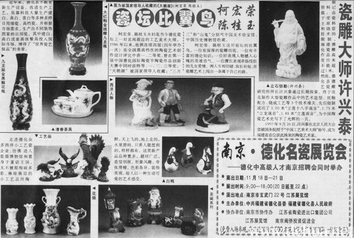 据资料记载:由于受、瓷土原料和烧窑技术的限制,福建德化瓷雕作品高度历来不能超过1米。然而,德化县德艺瓷雕研究所所长许兴泰通过长期探索,终于攻克制作大型瓷雕作品中的艺术造型、坯釉配方、烧成工艺等3个技术难关、先后烧制成功了1.05米“立莲十八手观音”、1.75米“立龙观音”、1.85米“立莲观音”,为中国陶瓷艺术史写下了光辉的一页。