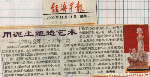 在一进展厅的厅边展位,青年陶瓷艺术家陈仁海的作品,吸引了不少收藏者和欣赏者的关注。据他介绍,在短短的两天中,他的作品已被众多收藏爱好者购买。某企业一下就看中了他的《金陵春晓》作品,并当场向他订购了100套作为礼品。一位青年收藏爱好者,先后跑了3次,多方寻觅后,购下了他的《世纪吉马》作品。在他展出的作品中,他的《荷花女神》等3件作品,已被南京博物院收藏。