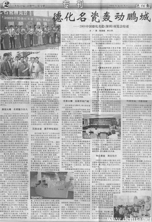 5月21日,2001年中国德化名瓷(深圳)展览会新闻恳谈会在深圳特区报业大厦举行。展览之前,深圳市10多家新闻媒体对德化名瓷莅深圳展览等进行了全方位、多形式的报道。5月23日、5月25日《深圳特区报》分别刊发了“德化名瓷本周六亮相深圳”、“流光溢彩德化瓷”专版。5月24日,《深圳晚报》刊发了“德化瓷器将在深圳亮相”专题。5月24日,《香港商报》刊发了“德化陶瓷再塑辉煌”专版。其它各大报刊、电台、电视台也相继对德化名瓷展览盛况进行跟踪报道。