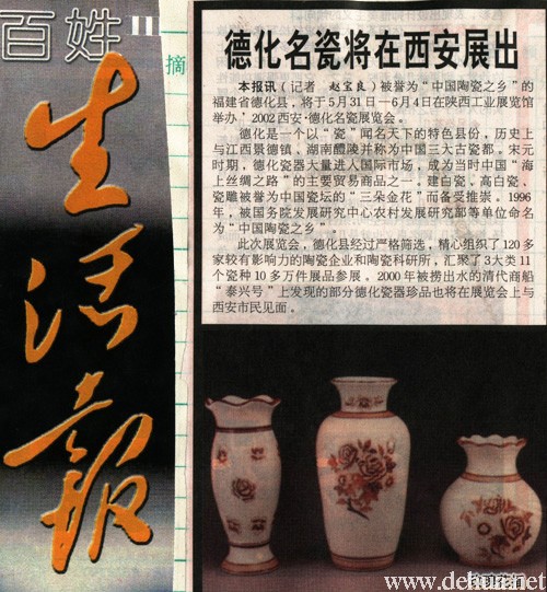 本报讯(记者赵宝良)被誉为“中国陶瓷之乡”的福建省德化县,将于5月31日一6月4日在陕西工业展览馆举办2002西安·德化名瓷展览会。