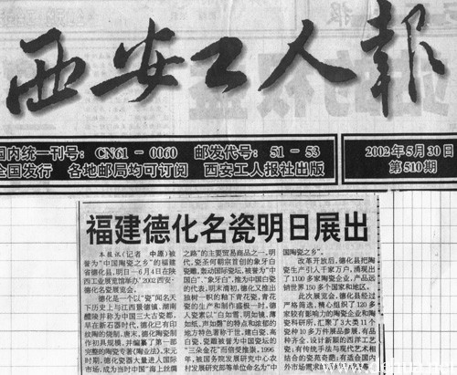 本报讯(记者中原)被誉为“中国陶瓷之乡”的福建省德化县,明臼一6月4日在陕西工业展览馆举办2002西安德化名瓷展览会。