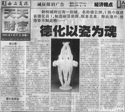 据传刺桐城西,戴云大麋,有个瓷雕大师沉迷十载,精心制作了一支奇特的瓷洞箫。此箫吹奏,东边来龙西边来凤,南边鱼虾跳跃,北边百鸟来仪。一吹风调雨顺,二吹五谷丰登,三吹万民康乐,四吹天下太平。此后,东边多了座龙浔山,西边有了凤凰山,南边鱼虾戏水,北边百鸟飞翔。龙浔山下,完民聚集成一小城,其各德化。德化的山民们撮土为瓷,以瓷为业,生生不息,遂成瓷都。千百年来,龙浔山演绎着一个个有关瓷的传奇。近十年间,瓷都德化人谱写了一首蜚声中外的瓷之歌。
