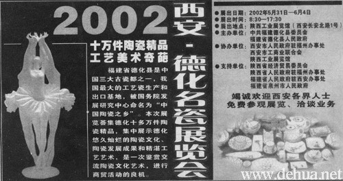 福建省德化县是中国三大古瓷都之一,我国最大的工艺瓷生产和出门基地,被国务院发展研究中心命名为“中国陶瓷之乡”。本次展览荟集德化十多万件陶瓷精品,集中展示德化悠久灿烂的陶瓷文化,陶瓷发展成果和精湛工艺艺术,是一次鉴赏交流陶瓷文化艺术,进行商贸活动的良机。