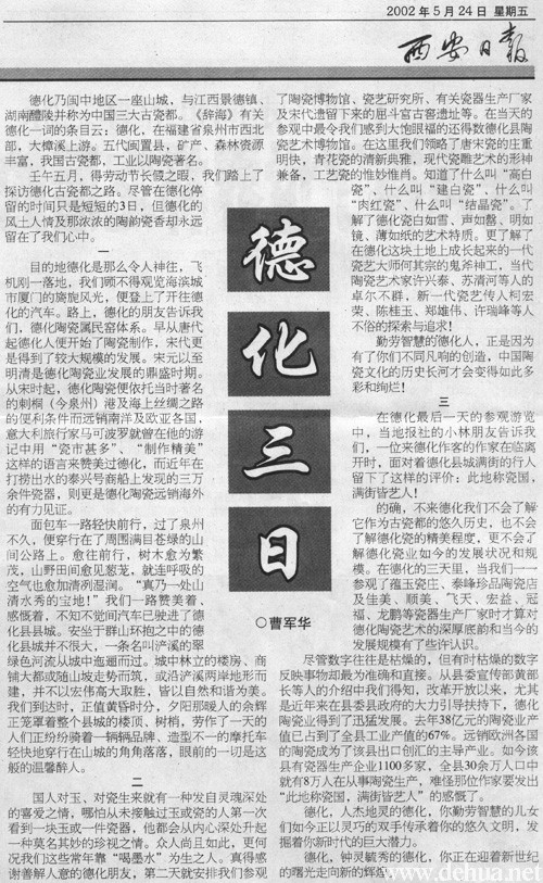 目的地德化是那么令人神往,飞机刚一落地,我们顾不得观览海滨城市厦门的旖旎风光,便登上了开往德化的汽车。路上,德化的朋友告诉我们,德化陶瓷属民窑体系。早从唐代起德化人便开始了陶瓷制作,宋代更是得到了较大规模的发展。宋元以至明清是德化陶瓷业发展的鼎盛时期。从宋时起,德化陶瓷便依托当时著名的刺桐(今泉州)港及海上丝绸之路的便利条件而远销南洋及欧亚各国,意大利旅行家马可波罗就曾在他的游记中用“瓷市甚多”、“制作精美”这样的语言来赞美过德化,而近年在打捞出水的泰兴号商船上发现的三万余件瓷器,则更是德化陶瓷远销海外的有力见证。