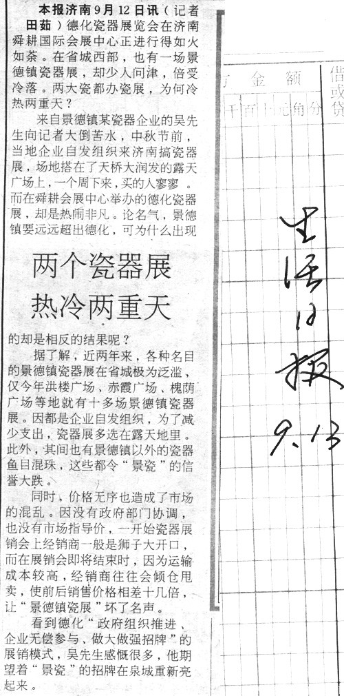 据了解,近两年来,各种名目的景德镇瓷器展在省城极为泛滥,仅今年洪楼广场、赤霞广场、槐荫广场等地就有十多场景德镇瓷器展。因都是企业自发组织,为了减少支出,瓷器展多选在露天地里。此外,其间也有景德镇以外的瓷器鱼目混珠,这些都令“景瓷”的信誉大跌。