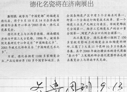 本刊讯被誉为“中国瓷都”的福建省德化县,将于9月10日至14日在济南舜耕国际会展中心举办2003济南·德化名瓷展览会。