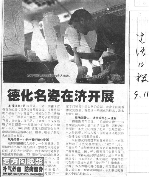 本报济南9月10日讯(记者 田茹)古香古色的清代灵芝纹青花盘碗碟,文静慈祥的“坐莲十八手观音”,栩栩如生的“将相和”、“三顾茅庐”雕塑,精巧别致的西洋花篮、首饰盒、日用品,让泉城市民深深领略了来自瓷都——福建德化的陶瓷文化韵味。今天,2003济南·德化名瓷展览会在济南舜耕国际会展中心拉开帷幕,吸引了数万名市民前来参观。