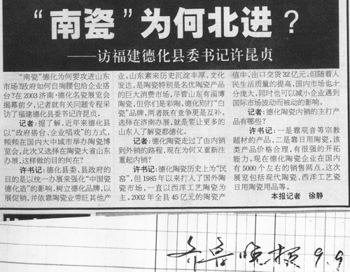 “南瓷”德化为何要攻进山东市场?政府如何自掏腰包给企业搭台?在2003济南·德化名瓷展览会揭幕前夕,记者就有关问题专程采访了福建德化县委书记许昆贞。
