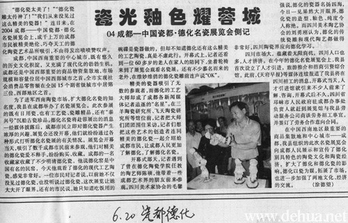 为了进军西南陶瓷市场,扩大德化名瓷的知名度,我县在成都举办了名瓷展览会。此次参展的既有日用瓷,也有工艺瓷、瓷雕精品,还有“泰兴号”沉船古瓷珍品。德化名瓷将赴蓉展出的消息一经媒体披露后,成都市民立即对德化瓷器产生浓厚的兴趣,展览会还没开幕,他们就纷纷通过各种形式打听德化名瓷展的有关情况。展览会开幕当天,吸引了数千成都市民前来参观,他们对精美的德化瓷爱不释手,纷纷购买、收藏。成都的一名收藏家收藏了不少明清德化瓷,他说德化窑是中国有名的民窑,今天他观看了德化的现代工艺陶瓷,感觉非常好。一位市民对记者说,以前她不仅没见过德化瓷,也没听说过德化瓷,这次展览让她大大开了眼界。还有的市民说,她只知道吃饭用的碗碟是瓷器做的,但却不知道德化还有这么精美的工艺陶瓷,真是不虚此行。开幕式上,记者还看到一位60多岁的老人在家人的陪同下,坐着轮椅来到了展览会观看名瓷展。还有不少慕名而来的老外,在维妙维俏的德化瓷雕前连声说“OK”。