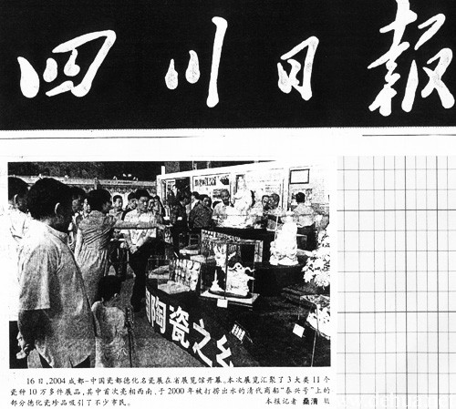 16日,2004成都-中国瓷都德化名瓷展在省展览馆开幕。本次展览汇聚了3大类11个瓷种10万多件展品,其中首次亮相西南、于2000年被打捞出水的清代商船“泰兴号”上的部分德化瓷珍品吸引了不少市民。