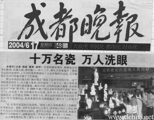 展台中央洁白高大的“滴水观音”锁住了众多市民的目光。由于烧制难度相当大,加之做工复杂,其价值达二十余万元。吸引参观者的还有十余件清代青花陶瓷。解说员称,这些作品属古董级,是参展作品中“年龄”最大的。在2000年被打捞出水的中国清代商船“泰兴号”上,共发现了35万件德化青花瓷器,当年11月,这些瓷器在德国被拍卖,总价值达2240万德国马克,德化县政府前往德化拍回了其中72件瓷器珍品,此次参展的青花陶瓷就是“泰兴号”上的部分珍品。