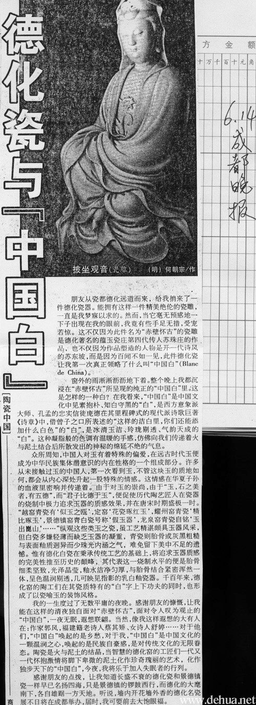 感谢朋友的点拨,让我知道长盛不衰的德化瓷和景德镇瓷一样早已名扬四海,只是景德镇的锣鼓西行,而德化的大麾南下,各自雄踞一方天地。听说,墙内开花墙外香的德化名瓷展不日将在成都举办,届时,我可要前去大饱眼福。