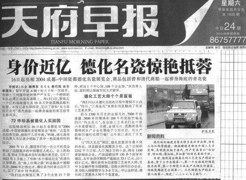 16日起亮相2004成都-中国瓷都德化名瓷展览会,展品包括曾和清代商船一起葬身海底的青花瓷