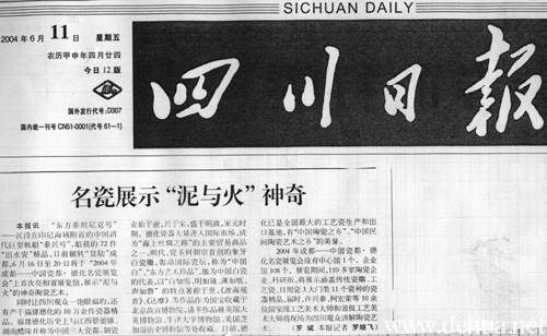 2004年成都——中国瓷都·德化名瓷展览会设有中心馆1个,企业馆108个,展览期间,110多家陶瓷企业、科研所,将展示涵盖传统瓷雕、工艺瓷、日用瓷3大门类11个瓷种的瓷器精品。届时,许兴泰、柯宏荣等10余位国家级工艺美术大师和省级工艺美术大师将现场为四川观众讲解陶瓷艺术。