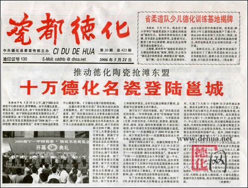 5月19日上午,南宁国际会议展览中心鼓乐喧天,彩带飘扬。由中共德化县委、德化县人民政府主办,南宁市经济委员会、南宁市商务局、南宁国际会议展览有限责任公司、广西福建商会、南宁市泉州商会、泉州市经济委员会、泉州市贸易发展局协办的“2006南宁——中国瓷都·德化名瓷展览会”在南宁国际会议展览中心隆重开幕。十万德化名瓷开始惊艳邕城。