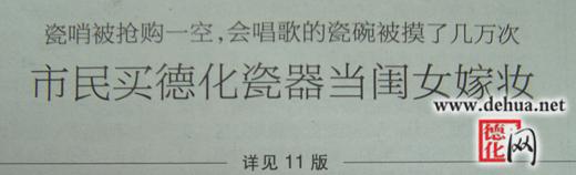 德化瓷器不仅成了邕城市民日用、收藏的珍品,还成了一些市民的婚喜嫁妆。一个汤姓的女教师在她母亲的带领下,选购了一件名叫《福满乾坤》的瓷雕精品。她母亲说,如今选购电器类作嫁妆,不但没创意,而且过了十年八年就过时了,意义不大,看了媒体介绍德化瓷器后,她和女儿商量了一下,觉得用德化陶瓷来作嫁妆也挺好的,所以特地赶来看看,这次选中了这件瓷器。觉得非常满意。看到德化陶瓷器卖得这么好,展会上南宁许多商家纷纷与德化陶瓷企业洽谈合作事宜。
