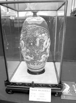 记者在现场看到:在一号展馆的企业展区里,共有90多个企业展位。076号展位展出的是济公系列瓷器作品,共有几十件,看,这个狡黠多智的济公,还会向人吐舌头;051号展位的展主,正在向观众演示瓷器的高科技——可以自动出水的茶壶,把杯子放在壶嘴下,茶水就自动地流到杯子里,杯满了,壶嘴又自动停水,让人连连称奇。而064号展位的国瓷苑展出的均是国家级礼品,雍容华贵,一件雕着金龙的高温红釉作品,含金量高达90%以上。