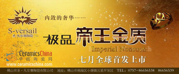 圣·凡尔赛陶瓷有限公司续在6月28日举行的“第六届中国防古砖高峰论坛”上获得“年度产品创新奖”后,伴随着金色的七月,推出了备受瞩目的顶级新产品“极品帝王金质”系列仿古砖。据了解,这次上市的是全球技术工艺最为成熟的“点金砖”,华丽中透着大雅,内敛中流露高贵,被认为是中国诞生的、引领全球化高端仿古砖消费潮流的技术代表。