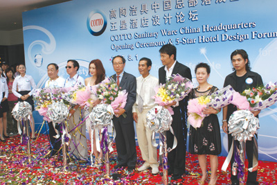 本报讯 (记者 刘小明) 8月1日上午11点,高陶洁具COTTO中国总部新展厅在一片欢乐祥和的气氛中盛大开幕,香港著名影星苗侨伟、温碧霞应邀出席剪彩仪式。中国建筑学会室内设计分会(CIID)副理事长劳智权、CIID深圳专业委员会刘力平秘书长、CIID东莞专业委员会会长兼新展厅设计师麦德斌先生、高陶洁具中国总代理高陶建材董事长彭洪萼、高陶洁具中国总代理副总经理周振宇以及泰国高陶公司销售总监与两位明星一起剪彩。