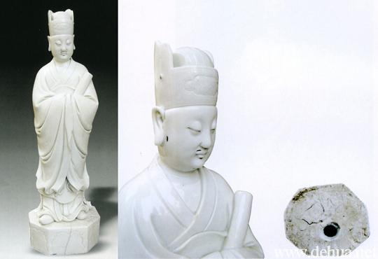 釉色白中闪黄,呈象牙色,温润细腻。文官头戴官帽,丹凤眼,鬓须以真毛填补,双手合拢于衣袖内,作执笏板状,神态闲然自若,立于台上,精雕细刻,线条圆润、流畅、洗练。底部仅留一小洞,系以整块瓷泥捏塑而成,胎体浑厚,有窑裂。