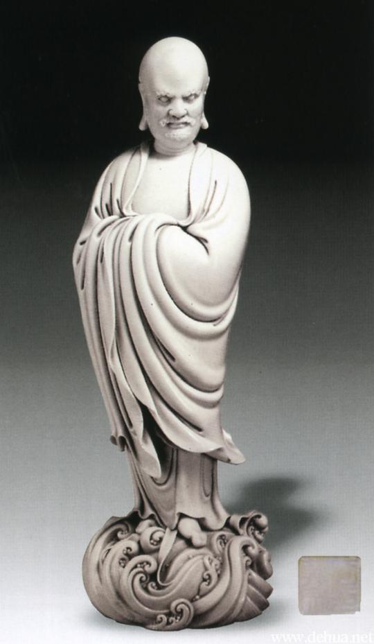 达摩容貌威严,身材伟岸,双手拢袖于胸前,赤足立于波涛之上,取材于达摩一苇渡江故事。此尊塑像胎体厚重,洁白坚实,通体施象牙白釉,釉面纯净莹润,背部钤有“何朝宗印”方形印章款。