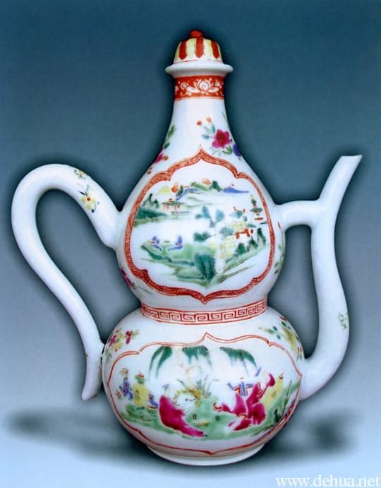 ▲清早期 五彩山水人物纹倒流壶(许回成藏) 高32厘米,底径14厘米