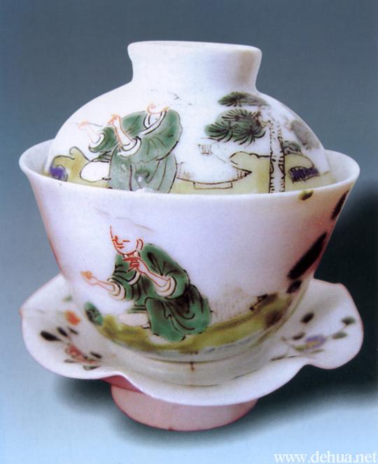 ▲清中期 五彩山水渔乐纹茶碗 高9厘米,口径6厘米