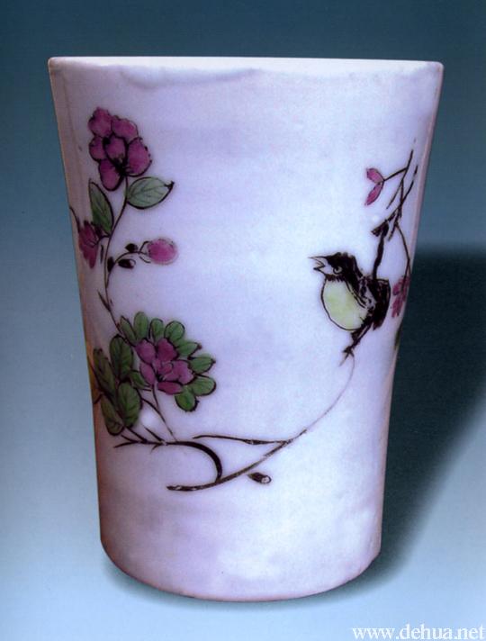 ▲民国 五彩花鸟纹笔筒(施政强藏) 高11厘米,口径8厘米