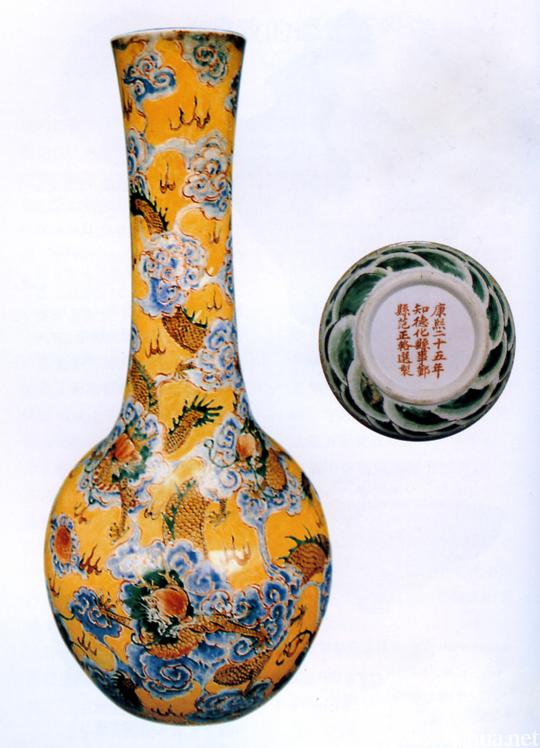 “古彩”(即康熙五彩)天球瓶一对  康熙二十五年(1686年),高51厘米,口径9厘米,底径13.4厘米,腹径78厘米,瓶底书铭“康熙二十五年知德化县事鄞县范正辂选制”字样。