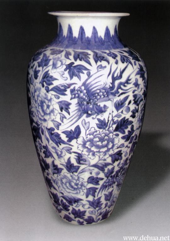 ▲清早期 青花凤凰牡丹纹瓶(刘以溪藏) 高39厘米,口径14厘米