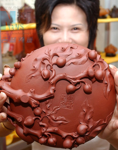 8月16日,一名参展工作人员在展示紫砂艺术品“圣桃笔洗”。当日,“2007首届中华艺术品收藏博览会”在长春市中日友好会馆拉开帷幕。博览会为期4天,展出和田玉、寿山石、紫砂、陶瓷、书画、珠宝、苏绣等艺术精品。 新华社记者 尹炣 摄