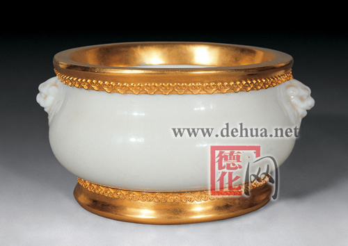 清早期,德化狮耳炉,直径12cm ,鎏金口底,篆书款。