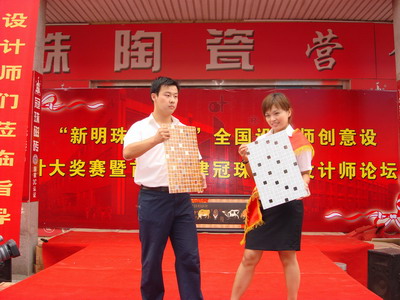 此次文化节秉承“创新、创意、设计”为主题,开幕式的舞台搭建也别出心裁,舞台全是用冠珠800×800㎜的瓷砖设计成独特的T型舞台,其崭新的创意设计为在场年轻设计人才带来了一个新的启发。同时,伴随着冠珠文化节的启动,津门首支“砖业模特队”闪亮出炉。这些行走在舞台上的模特,都是非专业人士,他们是天津冠珠的营销团队经过数天训练的“砖业模特队”,她们的表演融合了瓷砖创意与时装艺术,颠覆了传统意义上在瓷砖秀场上的配角地位,成为此次设计创意的灵感源泉体现 。模特们手中的款款精品演绎着时尚浪漫的生活品味,T型台上充满激情的丽人、帅哥与瓷砖相映成趣。