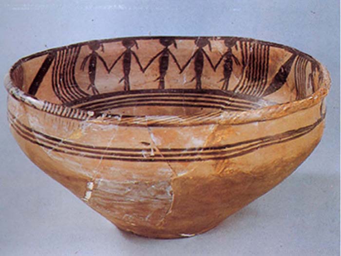 新石器时代 陶质彩绘。器高14.1cm、口径29cm。1973年青海大通县上孙家寨出土。属马家窑文化马家窑型,是当时彩陶中罕见的描绘人物形态的作品。