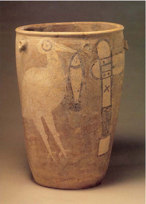 新石器时代、陶质彩绘、器高47cm、口径32.7cm。1978年河南省临汝县阎村出土,属新石器时代仰韶文化类型,陶缸绘有鹳鸟衔鱼,旁边竖立一件石斧的画面,作者用白色在夹砂红陶的缸外壁绘出鹳、鱼、石斧,以粗重结实的黑线勾出鹳的眼睛、鱼身和石斧的结构,画面效果粗犷有力,绘画具有中华民族远古时代的造型特征,是一件罕见的绘画珍品。
