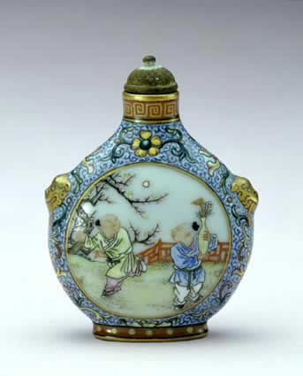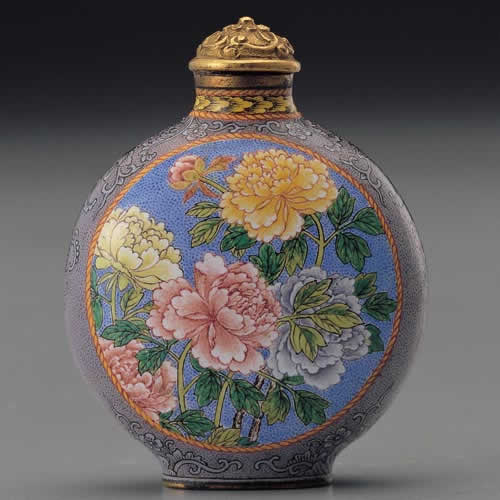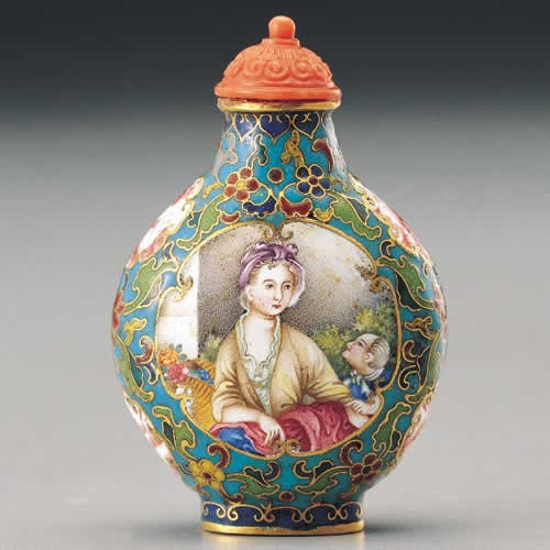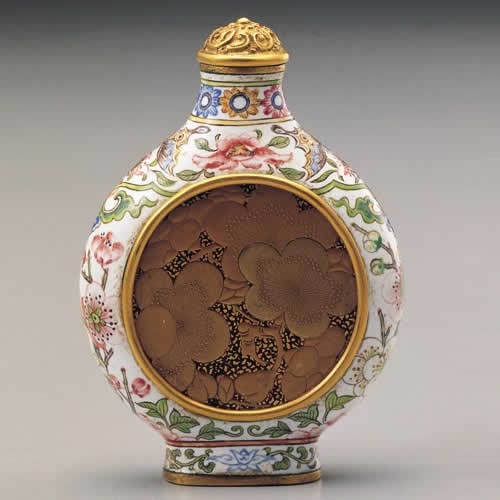 这一时期最出色的是珐琅彩鼻烟壶。珐琅器皿始于清康熙年间,清圣祖康熙非常喜爱珐琅器皿,曾命珐琅作烧造。康熙五十八年(公元1719年)特邀法国画珐琅匠、传教士陈忠信在养心殿造办处珐琅作传授法国里摩日画珐琅技艺。