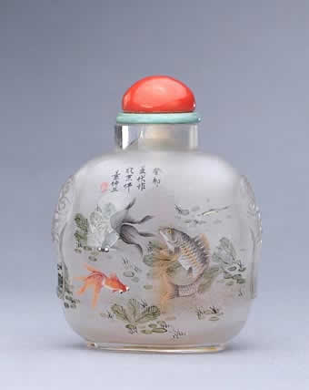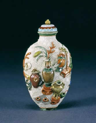 清代盛行鼻烟,应运而生的瓷制鼻烟壶也几乎囊括了所有瓷器类别,斗彩、粉彩、五彩、祭红、抹红、珊瑚釉、茶叶末釉、墨彩、珐琅彩、青花,釉里红,哥瓷、雕瓷、刻瓷等等无所不有。造型最多的是爆竹筒式,也有方形、扁方,葫芦形、圆形、瓜果形、双联,人物形等。