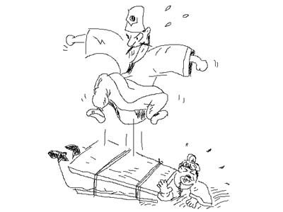 有个驼背信以为真,就请他医治。他拿了两块木板,不给驼背开药方,也不给他吃药,把一块木板放在地上,叫驼背趴在上面,用另一块木板压在驼背的身上,然后用绳索绑紧。接着,便自己跳上板去,拼命乱踩一番。驼背连声呼叫求救,他也不理会,结果,驼背算是给弄直了,人也“呜呼哀哉”了。
