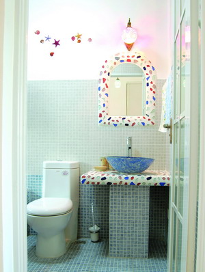 ●空间亮点:不忘缤纷琉璃。主卫里的镜框、洗手台面和浴缸台面是非常具有爱琴海风格的细节。看到那晶莹的水晶就有凉凉的感觉。这样的效果对施工要求很高:首先要用白水泥铺一层,然后把玻璃马赛克镶嵌在上面,再用填缝剂抹平表面。