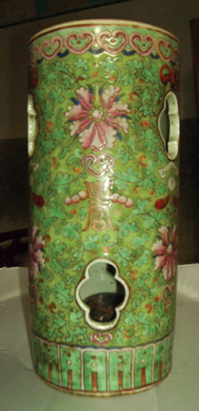 笔者家传一款帽筒,它属于粉彩开窗类的帽筒,是光绪初年晋商赠送给笔者家中先辈的祝寿礼品。
