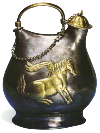 据史书记载,唐玄宗时曾训练舞马百匹,每当八月五日玄宗生日时,在勤政楼前大宴群臣,以舞马跪拜献寿。正如唐人张说《舞马词》所咏:“屈膝衔杯赴节,倾心献寿无疆。”银壶上的舞马形象表现的正是这一场面。舞马表演时装饰华美,“咀衔拉铁并权奇,被服雕章何陆离,紫玉鸣珂临宝蹬,青丝彩络带金羁。”(薛曜《舞马篇》)。但它们中的一些,其结局却令人为之扼腕叹息。安史之乱时,玄宗仓皇出逃,无暇顾及这些舞马。安禄山入长安后,知其能舞而“心爱之”,于是将数匹置之范阳,以后它们又辗转归于田承嗣所有,田不知其技而视作一般战马。一日军中宴饮奏乐,马闻乐起舞,军士以为妖异,用扫帚责打,马以为是自己舞得不好,更加卖力,田承嗣更令痛打,这些技艺超群的舞马就这样毙于枥下,唐代的舞马也就此失传。