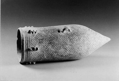 据专家们考证,这是仰韶时期较为常见的汲水器,它巧妙地利用了重心原理和平衡原理。使用时将尖底瓶放置于水中,等水自口流满时,尖底瓶会自动竖起。瓶身有一系,可系绳,倒“曰”字刻划文应为族徽,是氏族部落之间相互区分的标志。